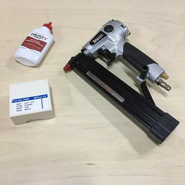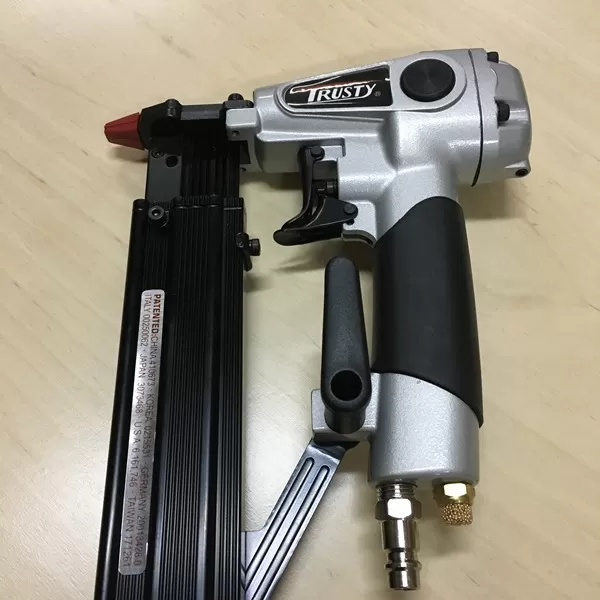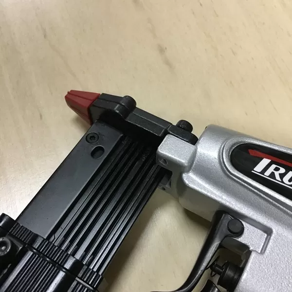 Появилось крепление для ремня, что позволяет вешать инструмент на пояс при монтаже наличников. Благодаря выхлопу воздуха в нижней части рукоятки инструмента, шпилькозабивной пистолет работает очень тихо. Основное применение — фиксация деталей при склейке, работа с мебелью, наличниками, плинтусами, высококлассные ремонтные работы.